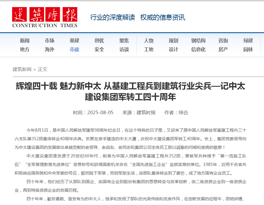 | 建筑時(shí)報(bào)8月5日?qǐng)?bào)道了輝煌四十載 魅力新中太 從基建工程兵到建筑行業(yè)尖兵——記中太建設(shè)集團(tuán)軍轉(zhuǎn)工四十周年 |